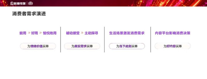 消费侧的变化同样深刻:其一,消费者需求从“能用、好用”升级为“愉悦的用”,47%的消费者倾向于选择能产生情感共鸣的品牌;其二,消费者决策更理性,抖音每月80%的用户会主动发起搜索,视频看后搜索量同比增长60%,主动找品牌成为消费决策的重要环节;其三,需求场景化特征凸显,不同场景下的用户痛点差异显著,为品牌营销提供了细分机会;其四,消费者注意力大规模迁移至内容平台,这里成为品牌发现、理解与互动的主要阵地。