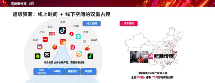 这一解决方案的基础,源于超级资源的深度整合。数据显示,过去一年短视频总使用时长新增86亿小时,内容平台已占据用户超50%的日常时长,成为品牌与消费者建立情感共鸣的核心阵地。与此同时,抖音还诞生了2万+热点话题,从“多巴胺”生活到“美拉德”穿搭,为品牌借势营销提供了丰富场景。而新潮传媒深耕的社区线下场景,承载了 80% 的消费交易,其梯媒具备“高频、必经、低干扰”的独特优势,用户主动关注度达45%,远超传统户外广告。